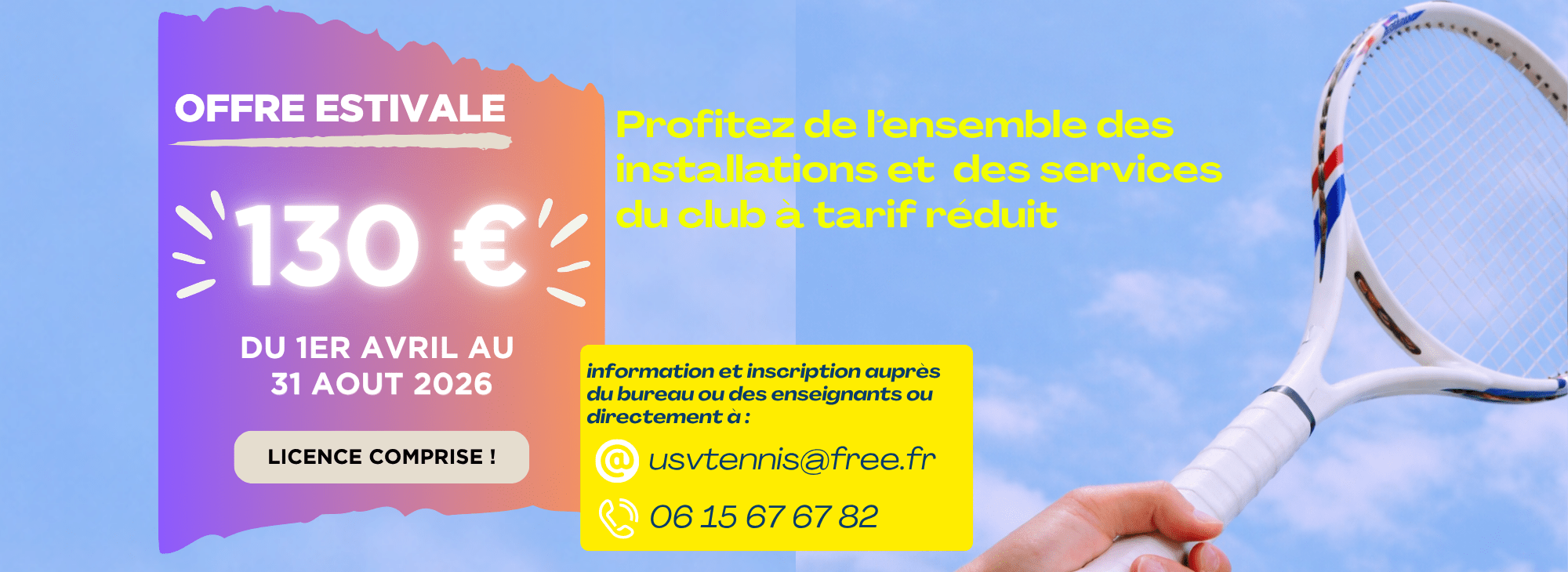 L’USV Tennis forme débutants, passionnés et champions en herbe dans l’apprentissage et le perfectionnement du tennis. Que vous veniez en famille ou entre amis, pour la compétition, ou tout simplement pour vous dépenser, toute notre équipe vous accueillent 7j/7 sur nos installations des Esselières (3 courts couverts) et de Guy Boniface (2 courts semi-couverts).