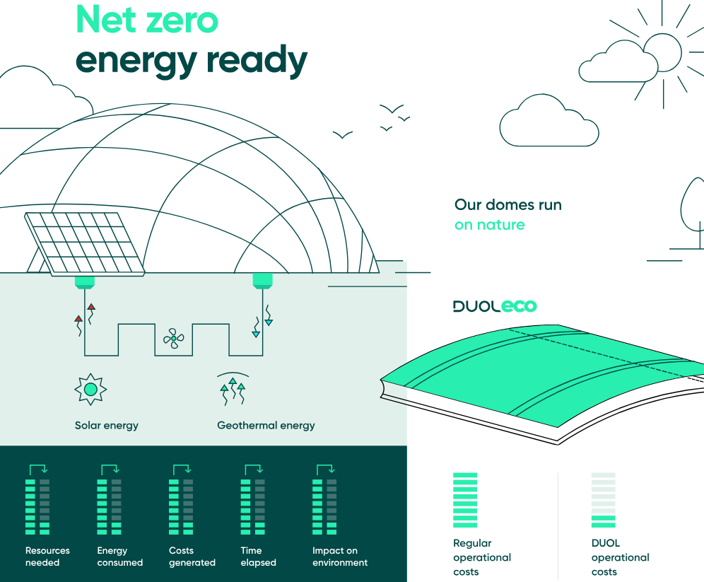 Le système de toile DUOL ECO réduit les coûts d’exploitation, ce qui fait de DUOL la structure la plus efficace sur le plan énergétique.